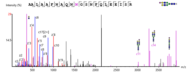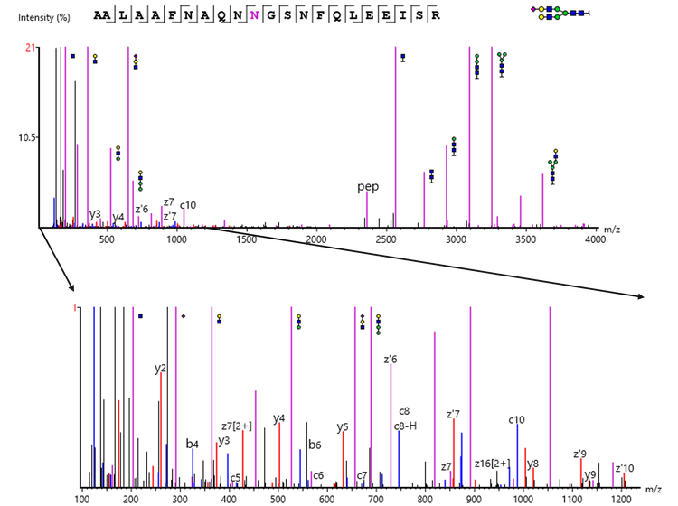 Another challenge for glycopeptide characterization comes from the labile nature of the glycosylation PTM. CID fragmentation of glycosylated peptides often provides limited peptide backbone information and typically results in fragments lacking the labile side chain modifications. Alternative fragmentation methods, such as EAD-based MS/MS, have been shown to yield more complete peptide backbone information. Additionally, EAD fragmentation provides site-specific PTM localization due to the retention of these modifications on the resulting fragment ions.1