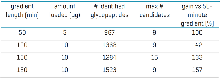minute gradient to 10 μg for the longer gradients. We also tried the 100-minute gradient with 15 maximum candidates instead of 9. Table 3 summarizes the results. The number of identified glycopeptides reported are the total number of glycopeptides identified in three replicate injections. The longer gradients enabled the identification of a significantly larger number of glycopeptides, while increasing the number of candidates in the DDA method did not improve the results with the 100-minute gradient.