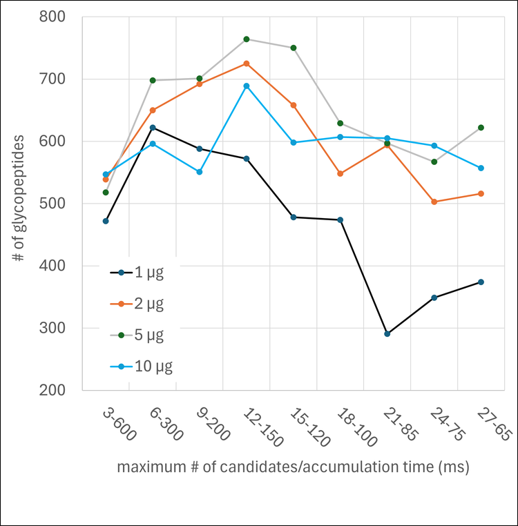 Previously, it was found that with the ZenoTOF 7600+ system, the optimal maximum number of candidates and MS/MS accumulation time were 9 and 200 ms, respectively.5 Using one injection per setting, the number of candidates and MS/MS accumulation time were optimized for the ZenoTOF 8600 system for various amounts of enriched sample. Figure 5 shows the number of glycopeptides identified for each condition. The cycle time was kept constant at 2 seconds for all experiments. For a low load (1 µg), optimal results were achieved with a similar maximum # of candidates and MS/MS accumulation time as what was found previously with the ZenoTOF 7600+ system. At loads 2 to 5 times higher, the optimal number of candidates shifts to 12-15, while at even higher loads, the number of identified glycopeptides drops again, likely indicating