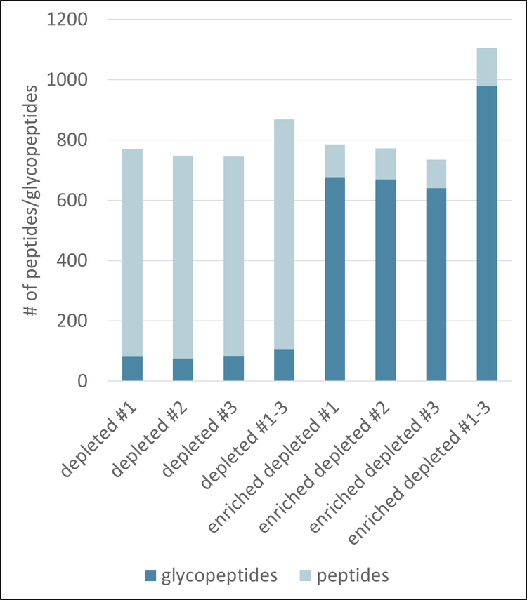 were adapted so that the TOF total ion chromatograms had similar intensities, indicating similar total loads of peptides. The fraction of glycopeptides increases from 12% to 88% in the enriched sample, illustrating that the commercially available spin columns work similarly well as the lab constructed spin columns.5