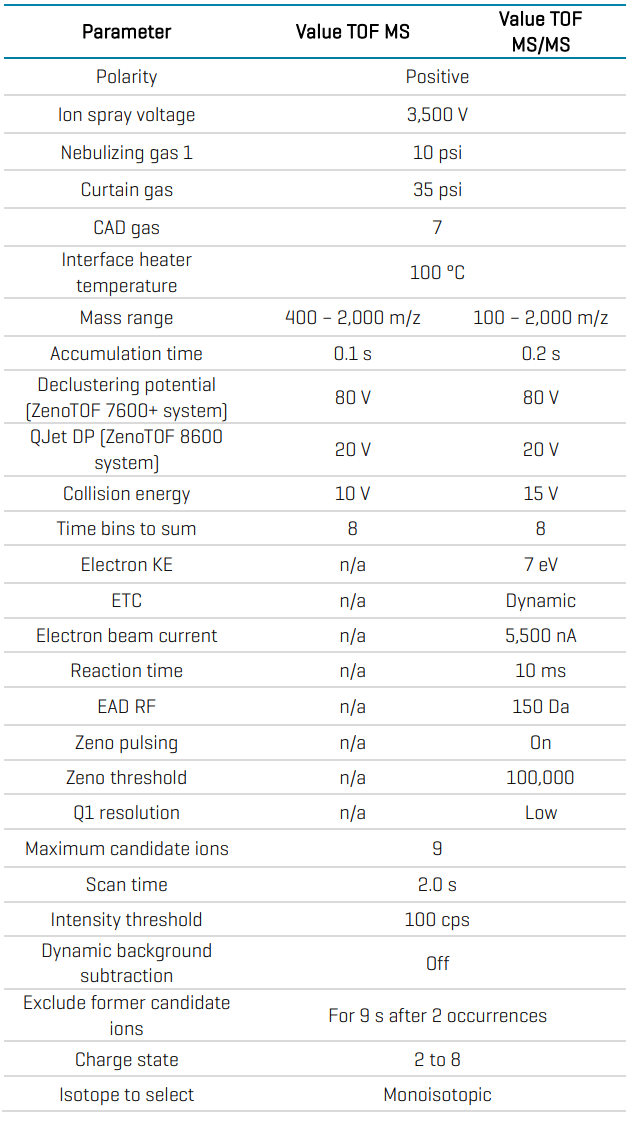 Mass spectrometry: Data was acquired using a ZenoTOF 7600+ system with an OptiFlow Turbo V ion source, and a ZenoTOF 8600 system with OptiFlow Pro ion source, both in nanoflow mode. MS parameters used, unless specified otherwise, are listed in Table 1. 3 replicate injections were performed for each sample as indicated.