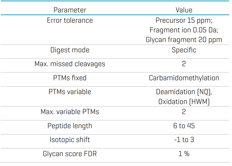 Data processing: Glycopeptide identification was performed using PEAKS GlycanFinder 2.0 software (Bioinformatics Solutions Inc).3 This software identifies peptides and glycopeptides as described in Figure 2. A UniProt reviewed human plasma protein database downloaded on April 2, 2024 was used, in combination with the structural glycan database included in PEAKS GlycanFinder software consisting of 1,867 Nlinked glycan structures. Search parameters used, unless otherwise specified, are listed in Table 2.