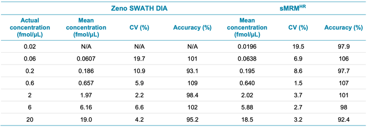 - Excellent linearity and accuracy were achieved with both MRMHR (3 orders of magnitude) and Zeno SWATH DIA (2.5 orders of magnitude) for high-resolution quantitative analysis