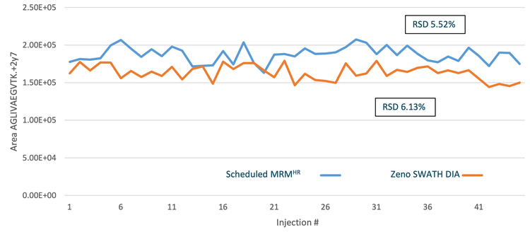 - sMRMHR and Zeno SWATH DIA methods were highly robust, with peak area relative standard deviations of 5.52% and 6.13%, respectively, over 45 consecutive injections