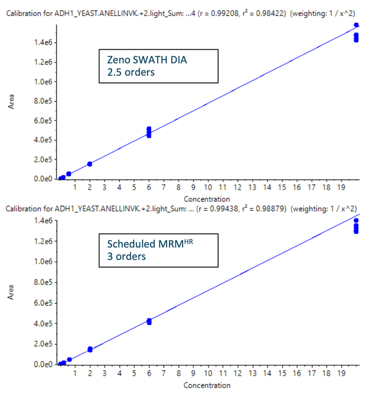 - Linear dynamic ranges spanning 3 and 2.5 orders of magnitude were achieved using MRMHR and Zeno SWATH DIA, respectively