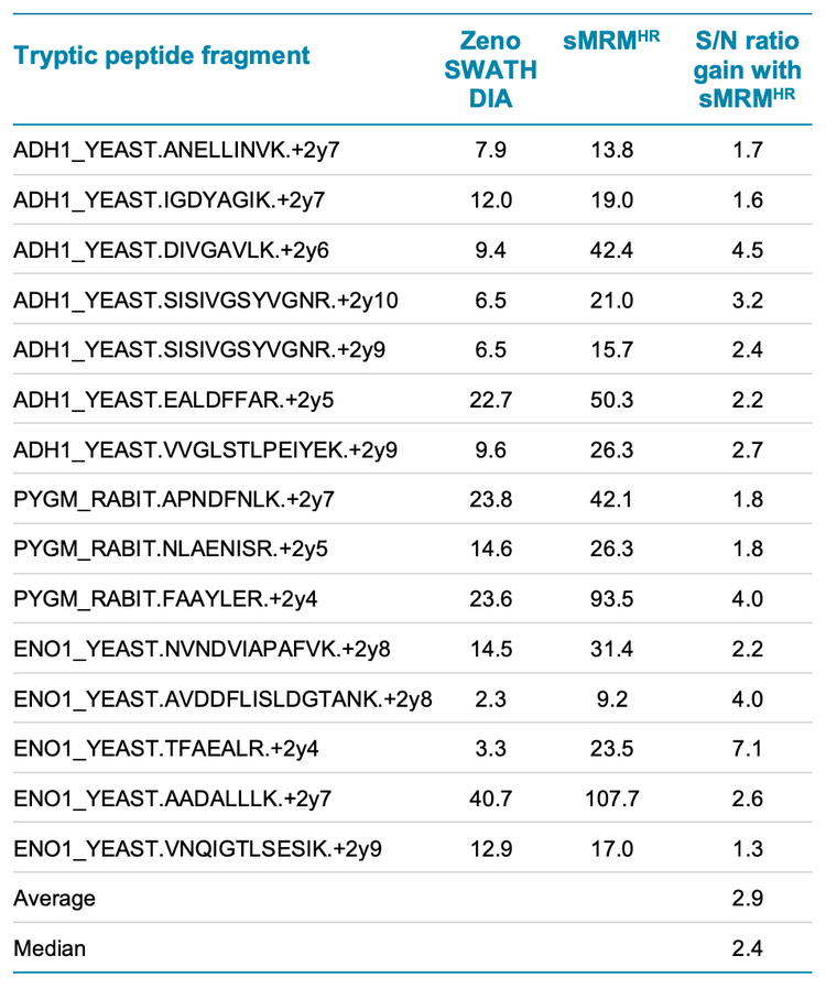 - On average, a 3-fold increase in sensitivity was achieved with MRMHR using 40 ms MS/MS accumulation times compared to Zeno SWATH DIA with 13 ms MS/MS accumulation times