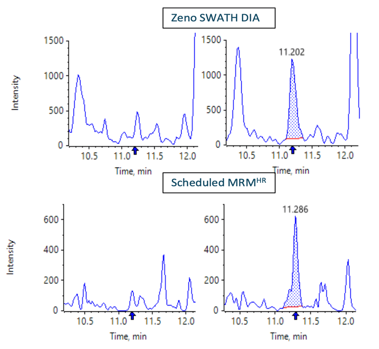 - MRMHR, using MS/MS accumulation times of 40 ms, was approximately 3x more sensitive than the Zeno SWATH DIA method with 13 ms MS/MS accumulation times
