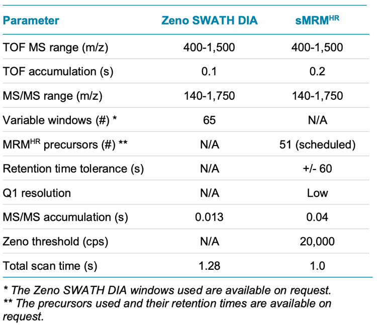 Mass spectrometry: The ZenoTOF 7600 system was operated in positive mode using the OptiFlow Turbo V ion source with a microflow probe and 1-10 µL/min electrode. The source conditions used included gas 1 set to 60 psi, gas 2 set to 20 psi, curtain gas set to 35 psi, and source temperature set to 225°C. The electrospray voltage was 4,500 V. The Zeno SWATH DIA and sMRMHR parameters used are listed in Table 2. The declustering potential was 80 V, CAD gas was 7, and time bins to sum was set to 8. The collision energy for TOF MS was 10 V. For MS/MS, the dynamic collision energy calculation for charge state 2 was used.