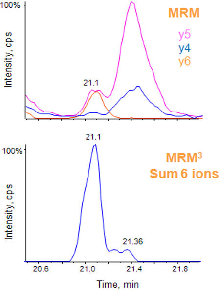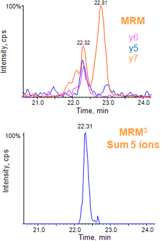 - The increased selectivity of MRM3 allowed for the elimination of chromatographic interference, resulting in superior analytical performance compared to traditional MRM.