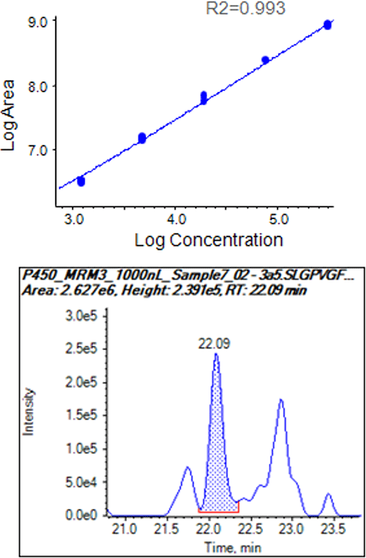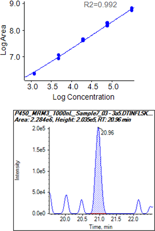 Sample preparation: Synthetic tryptic peptides to the CYP450 3A5 protein (both isotopically heavy and light) were used to design MRM and MRM3 assays (Figure 2). Standard concentration curves were constructed using the standard peptides in digested human liver microsomes (~1 ug of protein matrix on column). Light peptides were added as an internal standard and heavy labeled peptides dosed at levels between 305 amol to 805 fmol on column.