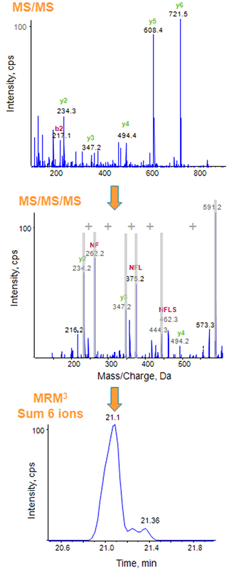 When a peptide is fragmented in the collision cell, a number of product ions are generated that can be assessed for use in MRM3 experiment (Figure 2, top). For the DTINFLSK peptide, the dominant y5 ion was isolated and fragmented in the linear ion trap to generate an MS3 spectrum (Figure 2, middle). Multiple secondary product ions are extracted using a width of 0.5 Da and summed together to produce the MRM3 signal shown (Figure 2, bottom). Integration of the resulting peak provides the quantitative data.