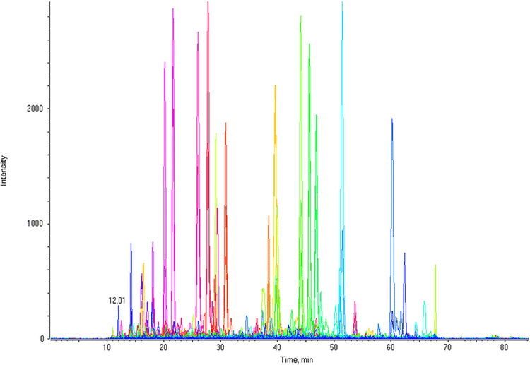 Multiple peptides per method can be analyzed by looping together multiple MS/MS scans in the experiment, and then extracting the relevant sets of fragment ions in the data processing, as illustrated in Figure 5. In this experiment 43 different peptides from 15 proteins were targeted from the yeast proteome. These MS/MS can also be scheduled in time to further increase the numbers of peptides that can be targeted in a single run.