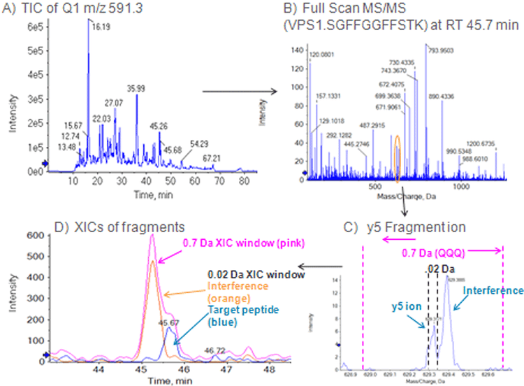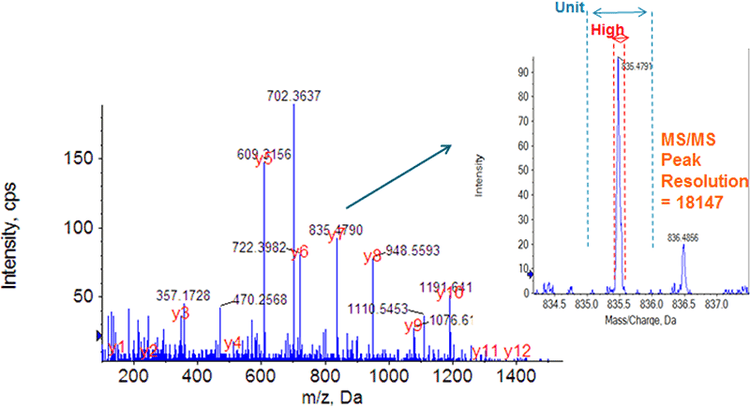 Because the full scan data is acquired all the time, data processing decisions such as which fragment ions to extract, what extraction resolution to use (Figure 3) and whether or not summing fragment ions can improve data quality are deferred until after the acquisition is complete. This simplifies assay development, as the only parameters that need to be determined upfront are the precursors’ m/z values and collision energy. Shown in Figure 4 (top) is an example for peptide VLDQLLLPYTTK from protein MRI1, where the summation of three fragment ions improved ion statistics and data quality.