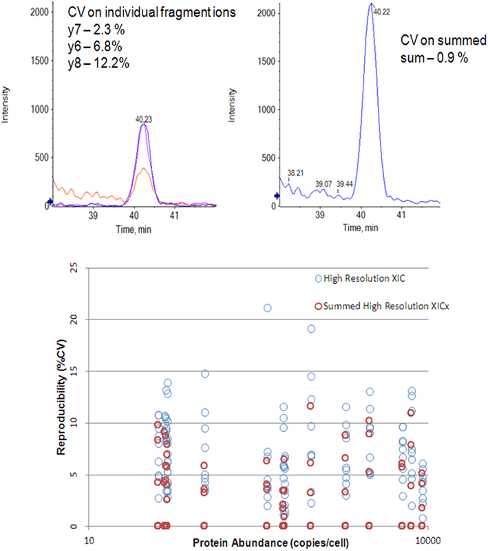 The global effect of this summation of ions on improving reproducibility is illustrated in Figure 4 (bottom). The reproducibility of the raw peak areas across 3 replicate injections was measured on three fragment ion XICs (Figure 4, bottom, blue). The peak areas for the three fragment ions were summed, and the reproducibility of the summed peak area was assessed (red). The results show that better reproducibility is often achieved for low abundant proteins through the summation of fragment ions.