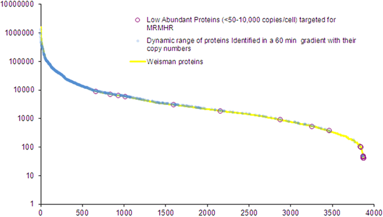 Mass spectrometry: Multiplexed looped MS/MS acquisition methods (MRMHR methods) targeting proteins spanning a range of abundances from 10,000-<50 copies/cell were developed using Skyline software. Data was acquired on the TripleTOF® 5600 System, where Q1 resolution was set to Unit and CE was computed for each precursor. High sensitivity MS/MS mode was used, to obtain MS/MS spectra with resolution >15,000 (FWHM). Accumulation times were varied and replicates were run of each experimental condition.