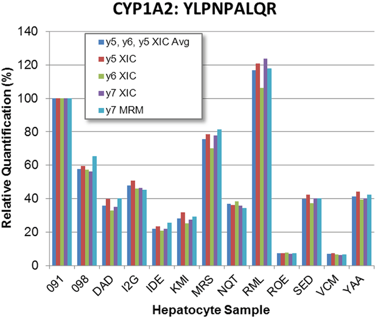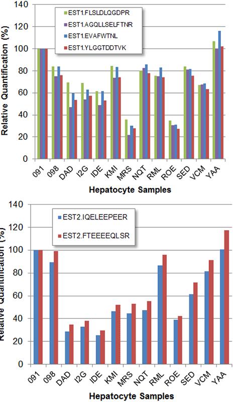 Figure 3 shows the relative comparison of the two phase II metabolism enzymes (liver carboxylase EST1 and EST2) across 13 samples. For comparison, the peptide signal was normalized against sample 091. A good correlation of quantitative differences was observed across multiple peptides of each of the two proteins, demonstrating that good reliability was observed in the SWATH Acquisition data.