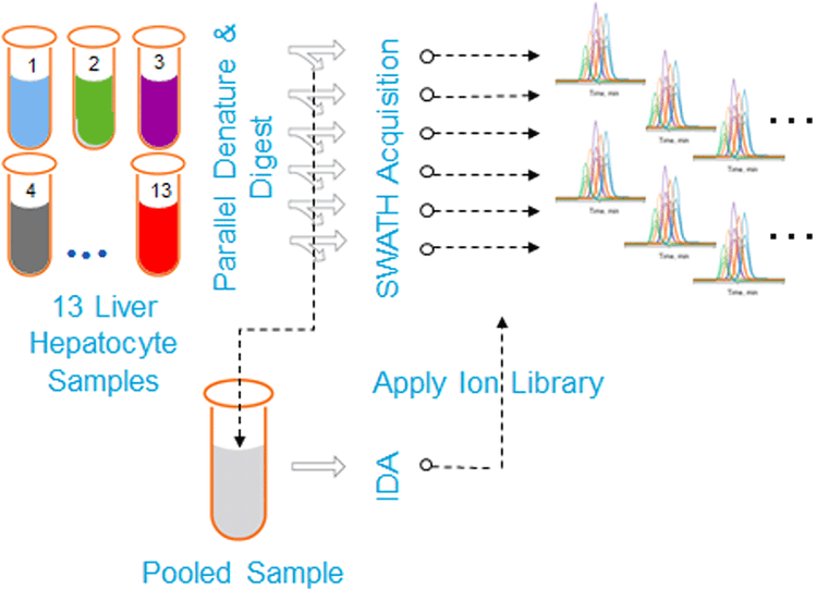 Mass spectrometry: Eluant from the column was sprayed using the NanoSpray® Source into a TripleTOF® 5600+ System (SCIEX). Data were acquired using an SWATH acquisition method with a Q1 window size of 25 Da and a mass range of 400-1000 m/z (cycle time 2.5 sec). Information dependent acquisition (IDA) experiment was performed on the pooled sample to obtain peptide identifications to generate ion library. Thirteen individual hepatocytes samples (labeled 098, 091, DAD, I2G, IDE, KMI, MRS, NQT, RML, ROE, SED, VCM, YAA) were analyzed in triplicate by SWATH acquisition (Figure 2). Protein/peptide data were loaded into Skyline for MRM assay development and samples were also run in triplicate by MRM on the QTRAP® 6500 System.