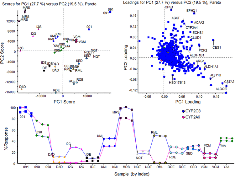 As PCA is a multivariate statistical analysis, the anti-correlation of proteins can also be discovered. Figure 6 (bottom left) displays an anti-correlated behavior between CYP3A4 and HSD17B13. At this moment, it is not clearly understood what biological events are behind this observation. But either anti-correlated or correlated behavior of inter- and intra- protein family isoforms may indicate their networking relations or metabolic activities.