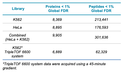 The data were then interrogated for overall protein and peptide identifications using the cutoff of <1% global FDR. The final K562 digest library contained 8,369 proteins at <1% global FDR and 213,441 peptides at <1% global FDR (Table 1). Compared to a previous library generation approach implemented using the TripleTOF 6600 system in which 20 fractions of K562 digest were run with 45-minute microflow gradients2, 1.2x more proteins and 3.4x more peptides were observed using the current approach (Table 1). Combining both the HeLa and K562 data resulted in a library with 1,000 more proteins than each of the individual libraries. This combined library was then used in subsequent SWATH acquisition data processing to examine its performance.