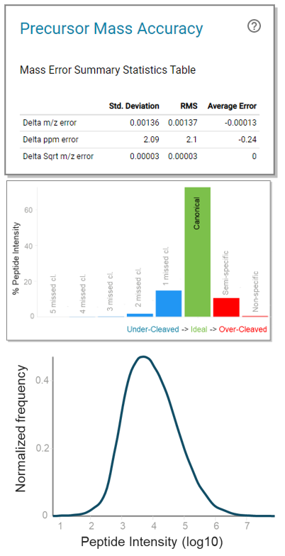 Zeno IDA data were collected for all K562 and HeLa digest fractions and processed using the cloud-based ProteinPilot application in OneOmics suite. The ProteinPilot application provides several visuals to assess data quality, including mass accuracy tables, digestion metrics and dynamic range plots. For the ion libraries, high-quality digestion and high mass accuracy in the underlying data were observed, illustrating the quality of the library generation approach (Figure 2). The peak areas of the detected peptide precursors were also plotted, highlighting more than 5 orders of dynamic range in the dataset.