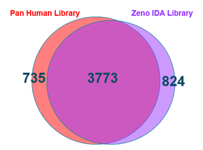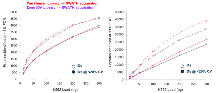 Large-scale protein identification results from both HeLa and K562 digests were generated using high-pH fractionation followed by fast microflow analysis using the ZenoTOF 7600 system. The entire acquisition workflow from fractionated samples to spectral libraries took less than 48 hours, incorporating robust microflow chromatography and Zeno IDA. Cloud-based data processing in the ProteinPilot application enabled streamlined processing of results and assessment of data quality. The combined HeLa and K562 protein identification results were then used to build a large ion library. This Zeno IDA library provided comparable results to the previously established Pan-Human Library for processing of SWATH acquisition data.