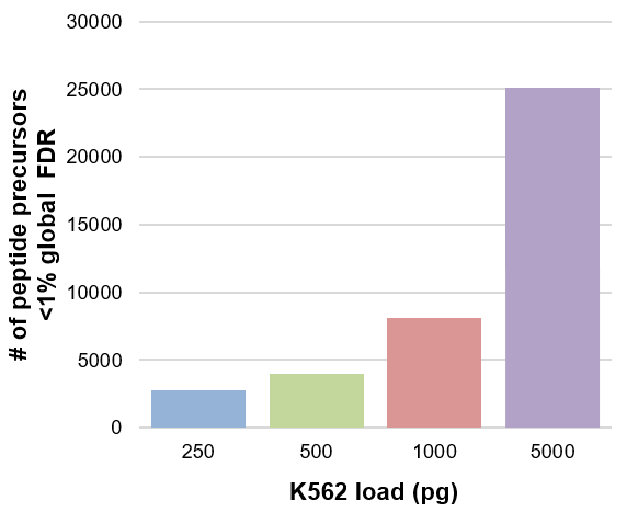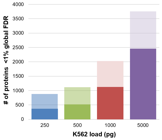 This work expands upon previous low-load experiments by leveraging nanoflow chromatography5 for enhanced protein and peptide detection. A 300 nL/min flow rate was used with 45 min gradients and a 15 cm nanoflow column for the analysis of sub-nanogram and nanogram amounts of K562 digest. Both library-based and library-free data processing strategies in DIA-NN were assessed for this workflow.