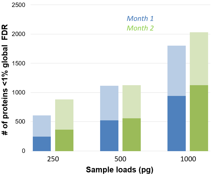 The inter-day reproducibility of low load experiments was evaluated by comparing 2 experiments performed 1 month apart. Different dilutions of the same K562 stock solution were prepared for each experiment and analyzed using Zeno SWATH DIA. Comparable identifications were observed at the 3 low loads (Figure 4).