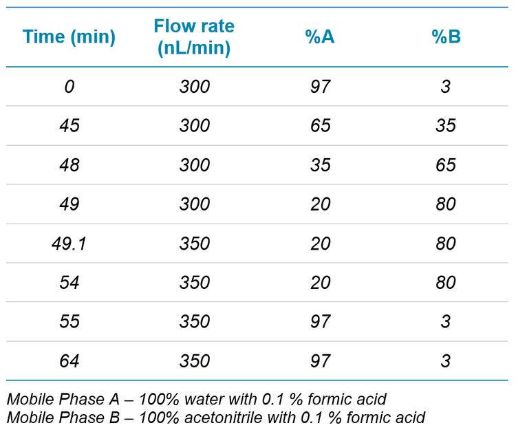 Chromatography: Separations were performed using a Waters ACQUITY UPLC M-class system plumbed for nanoflow chromatography (300 nL/min), using an Evosep analytical column (EV-1106 column,15 cm x 150 µm, 1.9 µm bead). All data were acquired using a 45 min gradient in direct injection mode with the gradient provided in Table 1.