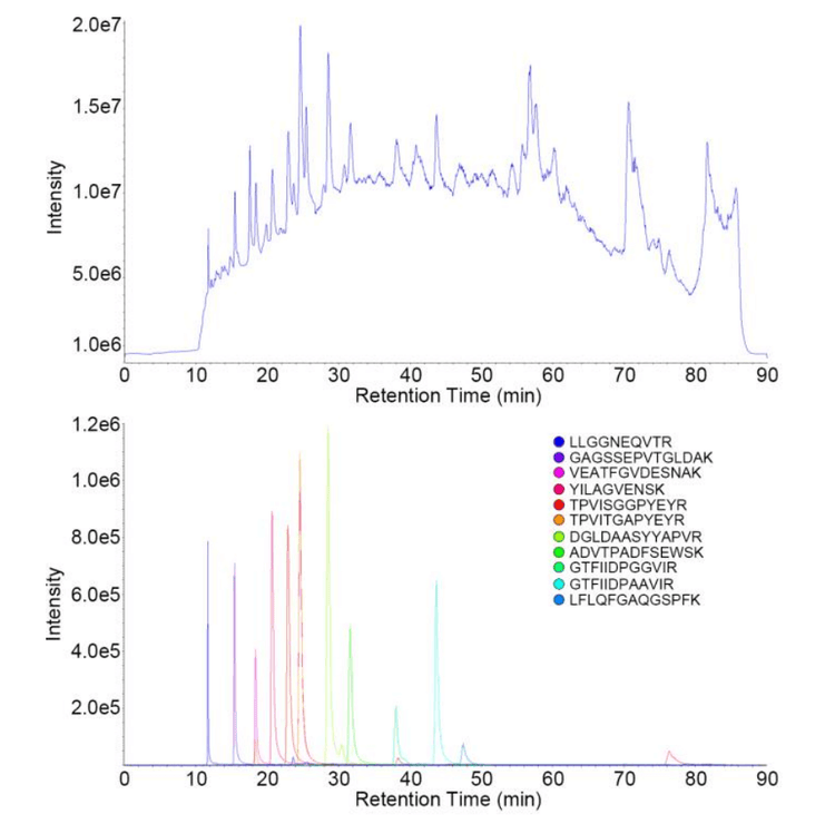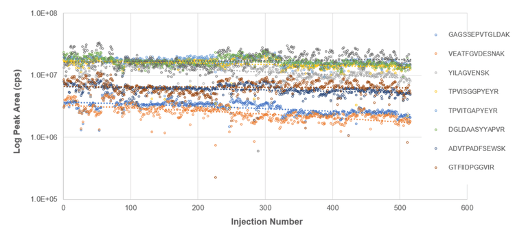 Using SWATH® Acquisition on the TripleTOF 6600+ System, a large immunopeptidomics study was performed. The OptiFlow Source with the NanoLC™ 425 System operating in nanoflow mode was used to perform over 500 injections of these complex peptide samples. Very good raw peak area was observed when monitoring the signals from the standard peptides spiked into each sample, highlighting the reproducibility of the spray electrode design, providing high spray tip lifetime and good reproducibility enabling much larger nanoflow studies.