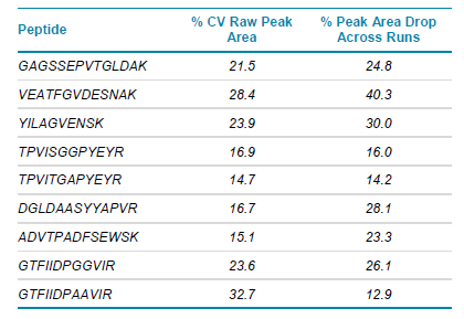 Here, the use of the OptiFlow Turbo V Ion Source and OptiFlow™ Interface were introduced into the nanoflow LC-MS platform being used by PureMHC in order to assess the impact on study reproducibility. SWATH® Acquisition is used to obtain a comprehensive analysis of the peptides in the samples for identification and specific quantification. The sample set consisted of 516 sample injections, performed over the course of 57 days with continuous operation, plus additional blank runs, QC runs, and calibration runs. No cleaning or instrument tuning was required during study.