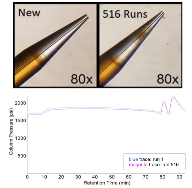 A large part of system reproducibility relies on electrode robustness, and remarkably, only a single electrode was used for the full study. The electrode was viewed under the microscope after all 516 injections and, although there was residue buildup, there was no sign of occlusion or degradation (Figure 3, top). Another good test is to monitor the column pressure across the sample set, as any occlusion in the electrode would result in an increase in pressure. Minimal pressure increases were observed (Figure 3, bottom).