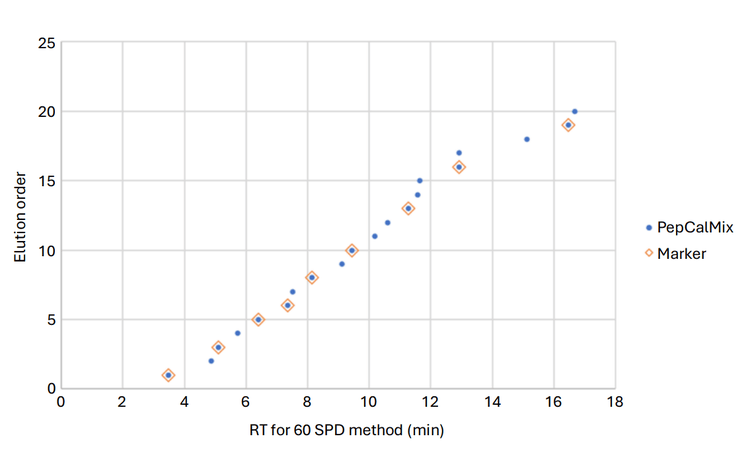 PepCalMix was chosen as the marker analytes for the development of an stMRM method due to their intrinsic desirable properties: they are not naturally occurring and share no sequence homology with any CHO peptides, they elute in a defined order across the full RT range with typical reverse phase-based peptide elution gradients, and they readily fragment with collision-induced dissociation to yield intense MS/MS fragment ions. Starting with the 60 SPD separation method, the RTs of the 20 PepCalMix peptides and the 119 CHO peptides were determined across the 21- minute active gradient using an unscheduled MRM method. Figure 2 shows the order and RT for the PepCalMix peptides at 60 SPD. The sample was also run in unscheduled MRM mode with the 200, 300 and 500 SPD separations. The results for PepCalMix are summarized in Table 1. Robust separation was demonstrated with no shifts in the PepCalMix peptide elution order.