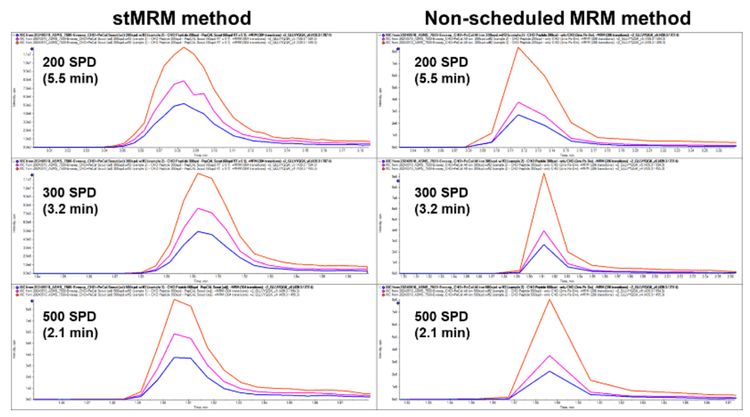- Ultra-high throughput peptide quantitation: Using a single stMRM method, 304 MRMs from 119 peptides were successfully monitored at various throughputs up to 500 SPD using the Evosep One system
