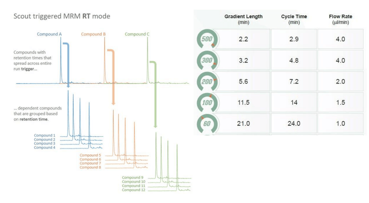 - Scout triggered MRM methods can be set up either through empirically determined or theoretically extrapolated analyte retention times for application to alternate gradient lengths