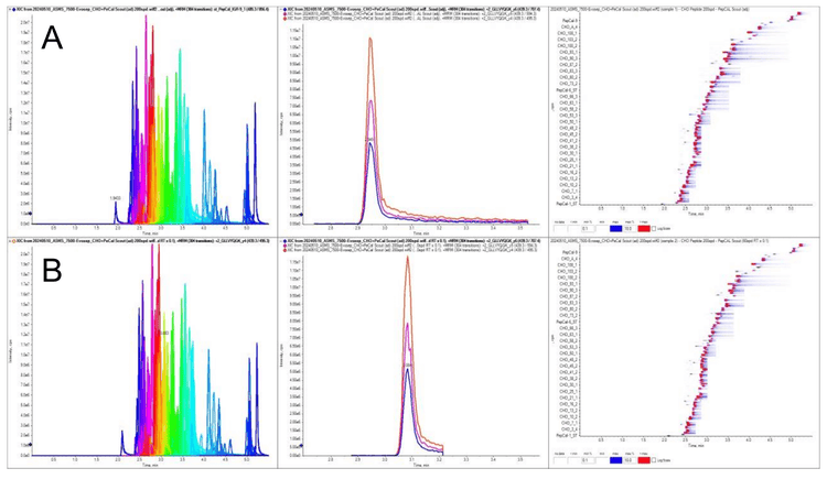 Sample preparation: A series of 119 peptides uniquely identified from CHO cell line trypsin digest were custom synthesized and used as representative peptides to be quantified. Multiple MRM transitions were chosen for each peptide (304 total) to ensure proper peptide detection. Bovine serum albumin (BSA) was purchased from Sigma Aldrich and digested with trypsin. A mixture of 20 isotopically labeled peptides (PepCalMix, SCIEX) and digested BSA were spiked into the CHO peptide background. LC-MS injections consisted of a final on-column mixture of 200 fmol CHO peptide mix, 50 fmol BSA digest and 50 fmol PepCalMix.
