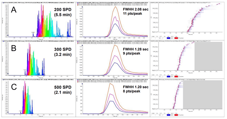 Chromatography: LC separation was performed on an Evosep One system using 60, 100, 200, 300 and 500 SPD methods (corresponding to elution gradients of 21, 11.5, 5.6, 3.2 and 2.2 minutes, respectively), following documented protocols5. Separations at 60 and 100 SPD were done using an EV1119 column (8 cm x 150 µm, 1.5 µm particle size), while separations at 200, 300 and 500 SPD were done using an EV1107 column (4 cm x 150 µm, 1.9 µm particle size. Mobile phases (pre-mixed, from Burdick & Jackson) consisted of 0.1% formic acid in water and 0.1% formic acid in acetonitrile.