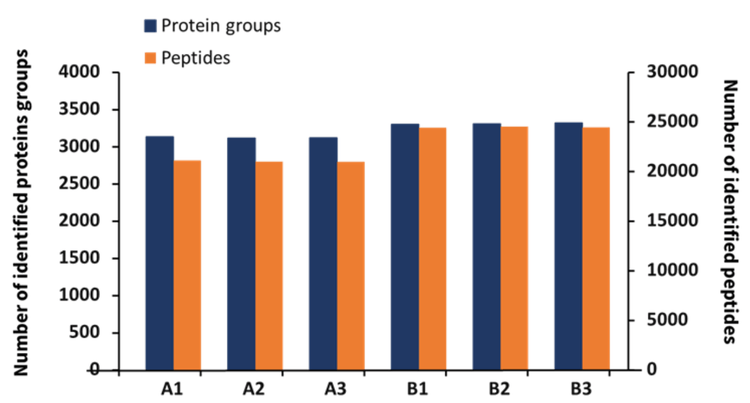 Figure 1. Histogram of identified protein groups and peptides in each human plasma sample. Two groups of human plasma samples were analyzed in triplicate using Zeno SWATH DIA with 30-minute microflow gradients. Data were processed with DIA-NN software using a spectral library approach. The numbers of protein groups and precursors detected are shown.