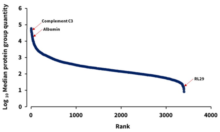 Figure 6. Abundance distribution of identified blood protein levels. The dynamic range of protein identification using Zeno SWATH DIA is highlighted by the detection of both high-abundance proteins, such as complement C3 and albumin, and proteins present at low levels, such as 60S ribosomal protein L29 [RL29], present at 0.2 ng/mL in plasma.