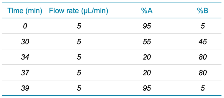 Chromatography: Liquid chromatography separation was performed with a Waters ACQUITY UPLC M-Class system with a Phenomenex Kinetex XB-C18 (2.6 µm, 100 Å, 0.3 mm x 150 mm) analytical column (P/N 00F-4496-AC) and Phenomenex Micro Trap C18 (100Å,5 µm,0.3 mm x 10 mm) trapping column (P/N 05N-4252-AC). Mobile phase A was 98% water with 2% acetonitrile and 0.1% formic acid and mobile phase B was 98% acetonitrile with 2% water and 0.1% formic acid. The LC gradient used is described in Table 1. The column was kept at 40°C for all injections.