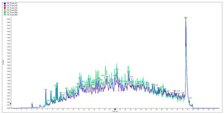 Figure 2. Overlays of the total ion chromatogram (TIC) traces for triplicate injections of both sample groups using Zeno SWATH DIA.