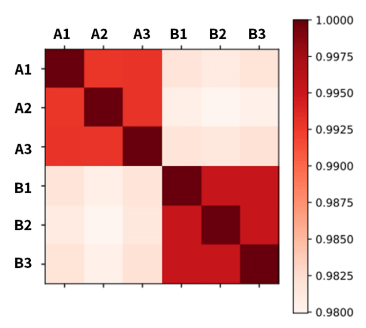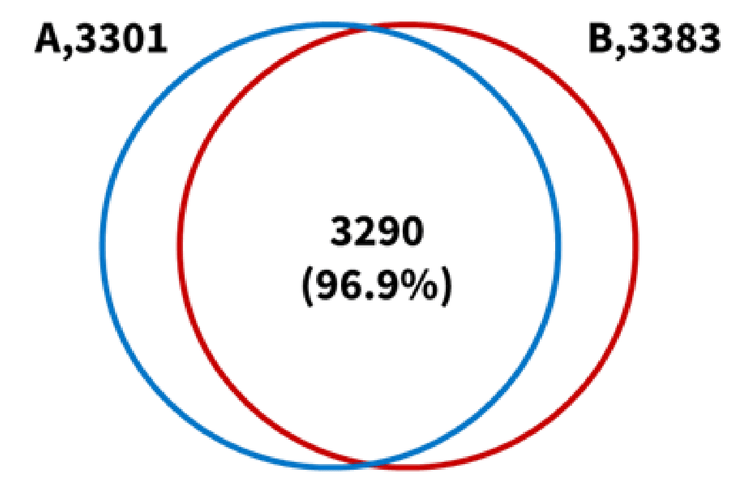 DIA-NN software was used to process the data collected by Zeno SWATH DIA. More than 3,200 protein groups were identified in the 2 groups of samples and more than 21,000 peptides were identified (Figure 1). Venn diagram analysis showed that 3,290 proteins were jointly identified in the 2 groups of samples, and the protein intersection ratio reached 96.9% (Figure 3). Heat map analysis indicated that the repeated acquisition of the same sample had a correlation >0.99 (Figure 4), due to the high reproducibility of Zeno SWATH DIA acquisition. Compared with the traditional DDA methods, Zeno SWATH DIA technology a higher coverage depth of the plasma proteome and better quantitative reproducibility (data not shown).