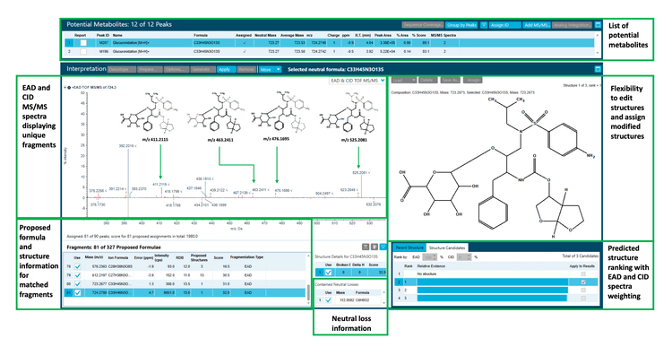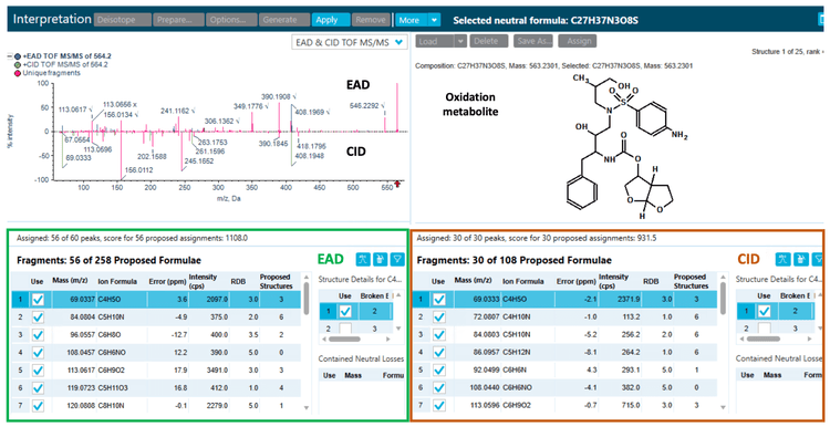 - Confident structure assignments: Analyze informationrich EAD spectra and CID spectra in a single results file to achieve more confident structure assignments for drug metabolites