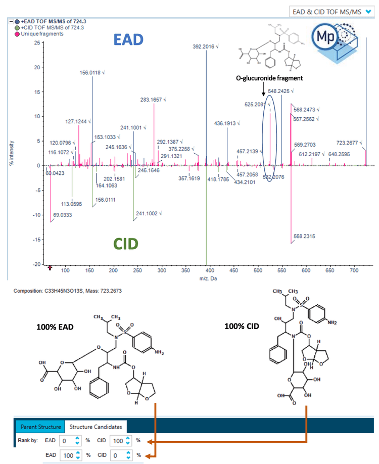 Interpretation of the site of metabolism was enabled by the automated assignment of the structures based on the relative weighting of Zeno EAD and Zeno CID spectra on a scale of 1-100%. The software also provides the flexibility to modify structures in the interpretation pane and the total score for the modified structures. Figure 2 shows the overview of the results panel, where users can view the list of potential metabolites and an overview of assigned structures and scoring information. Data can be presented with TOF MS or MS/MS spectra and XIC views. The software also displays the mass defect and isotope pattern of the metabolites. Figure 3 shows the interpretation pane with more detailed information on product ion matches for both spectra, unique fragments and user flexibility to modify and re-assign the metabolite structures. EAD spectra show unique fragments (m/z 476.1695, 463.2411, 411.2115 and 525.2081) supporting metabolite identification as o-glucuronide darunavir (Figure 3). Figure 4 shows higher scoring and more confident structure assignment for oxidation metabolite with EAD compared to CID data. The software also ranks all possible structures based on the total score for every metabolite structure. 1,2,3