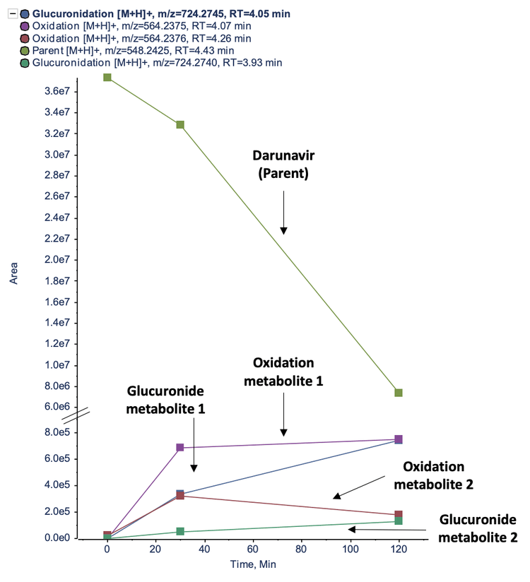 Sample preparation: Darunavir was incubated at 37°C in rat hepatocytes at a starting concentration of 1µM. Samples were removed from incubation and quenched with acetonitrile at 0-, 30- and 120-minute intervals for analysis.