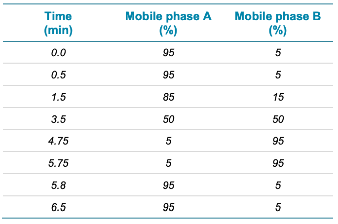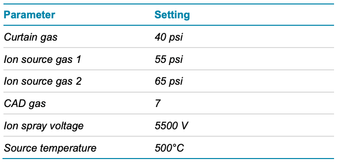 Chromatography: Separation was performed on a Phenomenex Luna Omega Polar C18 column (2.1 x 150 mm, 3 µm, 100 Å) at a temperature of 40°C. Mobile phase A was 0.1% (v/v) formic acid in water and mobile phase B was 0.1% (v/v) formic acid in methanol. A 5 µL injection was used for analysis.