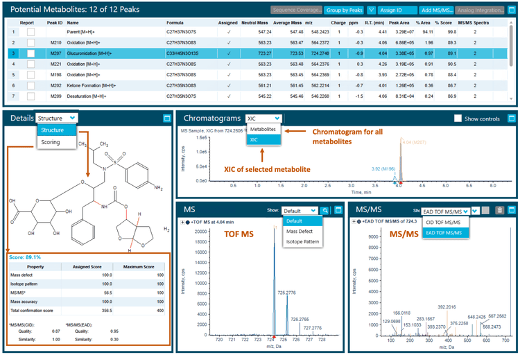 A 30-minute incubation sample of darunavir showed 12 potential phase I and phase II metabolites. The results panel from Molecule Profiler software displays an intuitive and detailed view of the selected metabolite, including its assigned structure, score, extracted ion chromatogram (XIC) and TOF MS and MS/MS spectra information for CID and EAD.