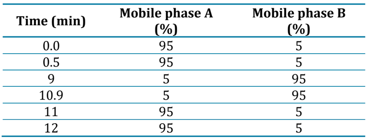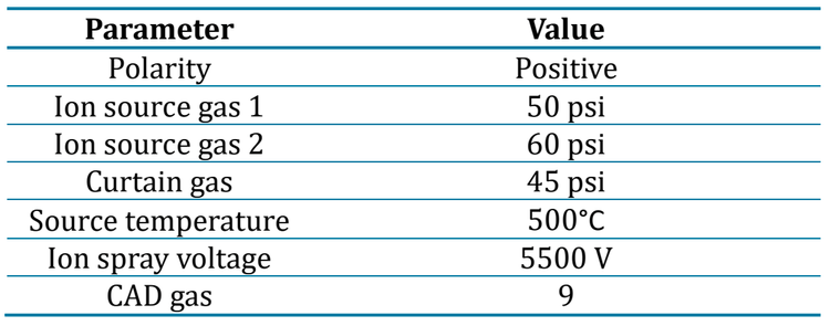 Chromatography: Analytes were separated using a Phenomenex Kinetex™ Polar C18 column (2.1 x 100 mm, 2.6 μm, 100 A ) column. The ExionLC AD system was operated at a 0.5 mL/min flow rate. Mobile phase A was 0.1% (v/v) formic acid in water and mobile phase B was 0.1% (v/v) formic acid in methanol. An injection of 5 μL was subjected to analysis. The chromatographic gradient conditions are summarized in Table 1.