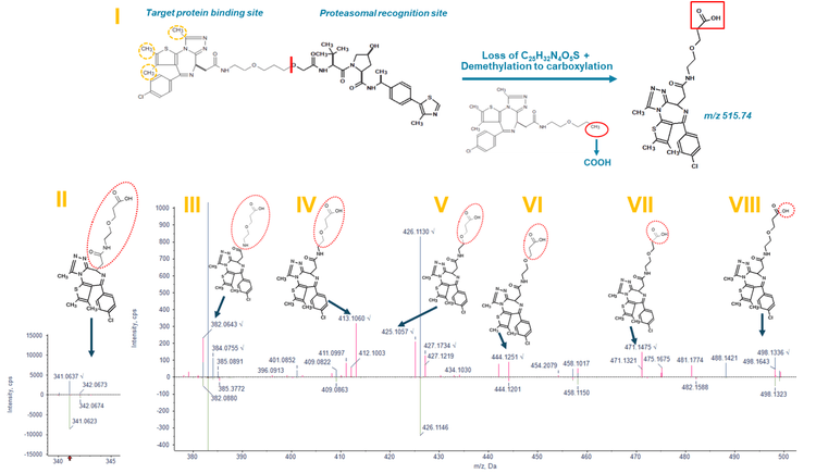 Several phase 1 metabolites were identified following a 30- minute incubation of ARV 771 in rat hepatocytes (Figure 2A). Figure 3 and Figure 4 illustrate the MS/MS spectra overlay from the interpretation pane for phase 1 metabolites from ARV 771, indicating carboxylation (following demethylation) where a loss of the target protein binding site (Figure 3) and proteasomal recognition site (Figure 4) are observed.