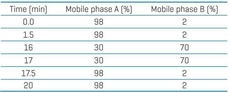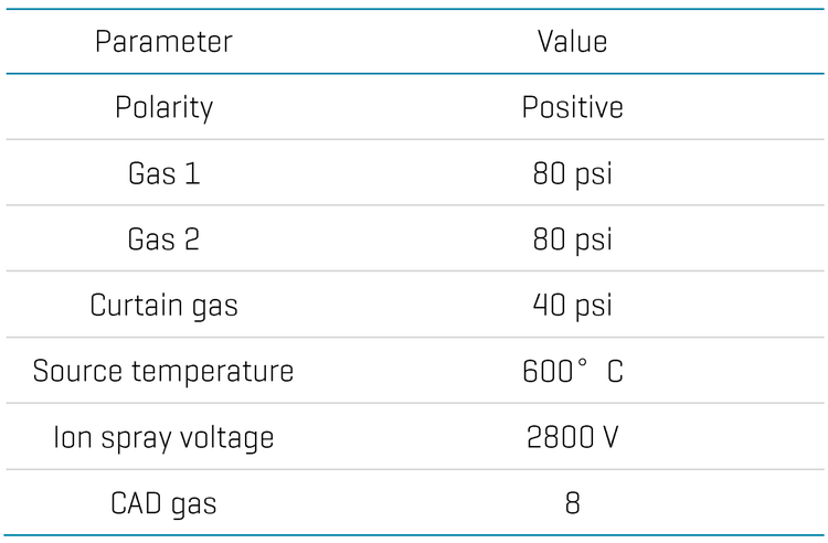 Chromatography: Analytical separation was performed on the ExionLC AE system using a Phenomenex Kinetex C18 (2.1 × 100 mm, 1.7 μ.m) column at a 0.3 mL/min flow rate. Mobile phase A was 0.1% (v/v) formic acid in water and mobile phase B was 0.1% (v/v) formic acid in acetonitrile. The column temperature was set to 55°C. The gradient conditions used are summarized in Table 1. A 5 μL sample was used for LC-MS/MS analysis.
