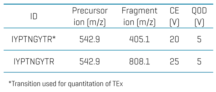 The method achieved excellent linearity, accuracy and precision from 0.0125 µg/mL to 100 µg/mL for TEx. The on-bead digestion immunoprecipitation workflow resulted in clean samples that enabled a sensitive quantitation of TEx.